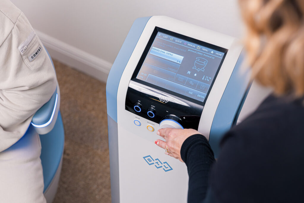 Emsella uses HIFEM energy to stimulate the pelvic floor muscles. When you sit on the Emsella chair, the energy penetrates deep into the pelvic floor and triggers supramaximal contractions. Each 30-minute session strengthens and reconditions the muscles that help prevent leakage, improve urgency, and support pelvic health.